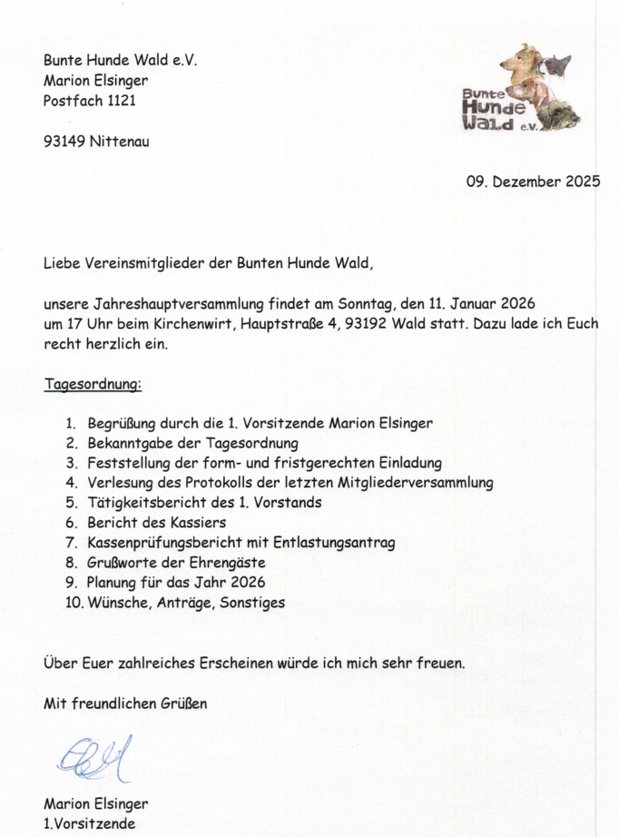 Die Vereinsmitglieder der Bunten Hunde Wald sind herzlich zur Jahreshauptversammlung am 11.01.2026 um 17 Uhr beim Kirchenwirt (Hauptstraße 4, 93192 Wald) eingeladen!